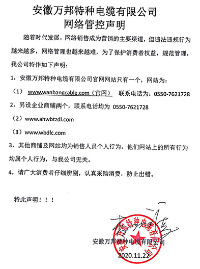 鄭重聲明:安徽萬邦特種電纜有限公司官方網站為:www_wanbangcable_com.zgjqqs.com,除此之外無任何子網站或合作網站,其余均為假冒偽劣。電話:0550-7621728 13485756353 地 址:安徽省天長市滁州高新技術產業開發區經四路29號